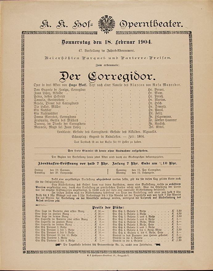 Chronology: Year 1904 Location: Vienna State Opera (Hofoper, Wiener Staatsoper) Program: Corregidor
