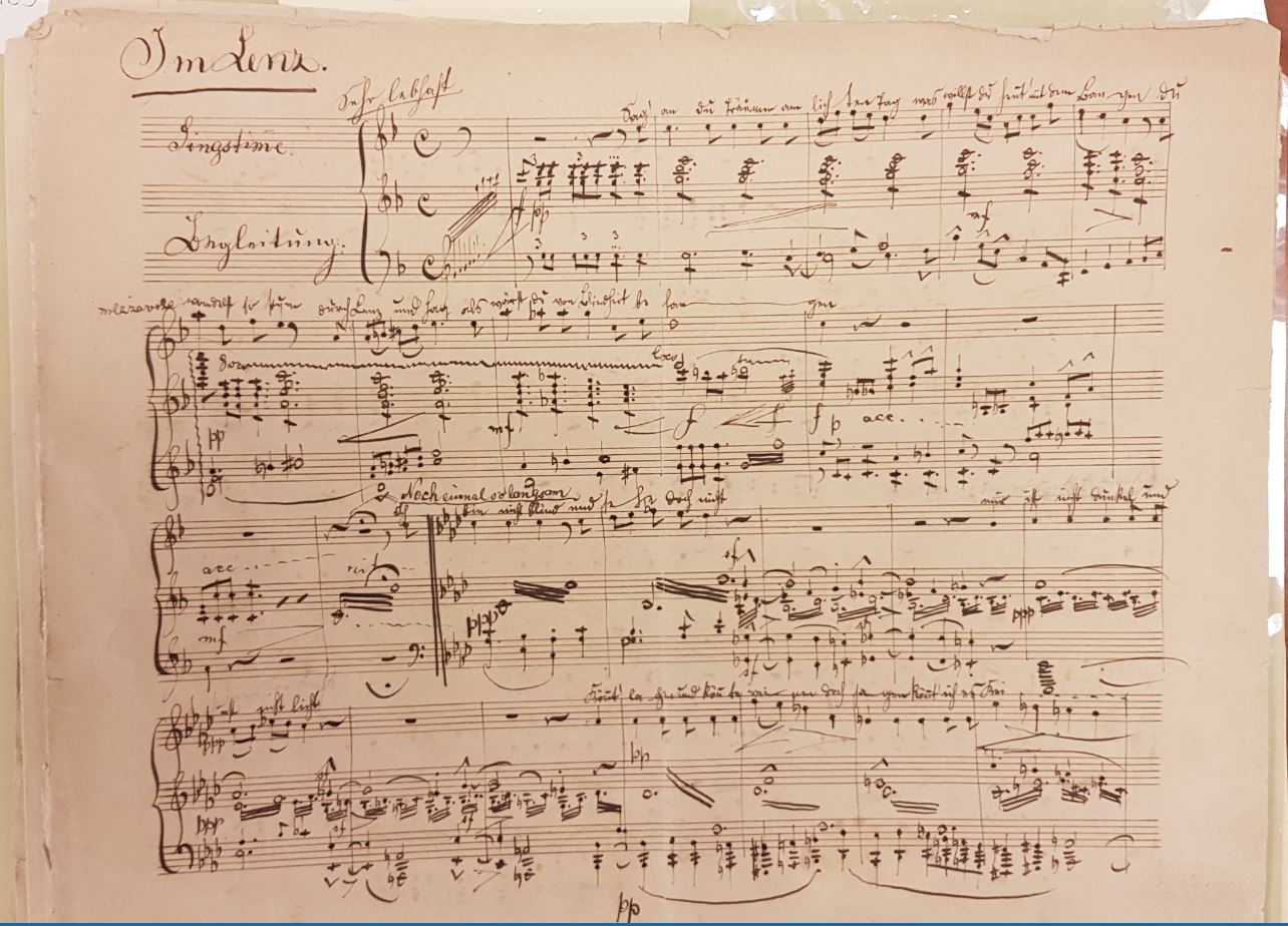 Im Lenz (Spring) alternates a lively musical idea for the first and third stanzas with a more mysterious passage for the second and fourth that is actually quoted from Mahler’s Das klagende Lied. Overall, the song vacillates from key to key and idea to idea too quickly to be musically effective.