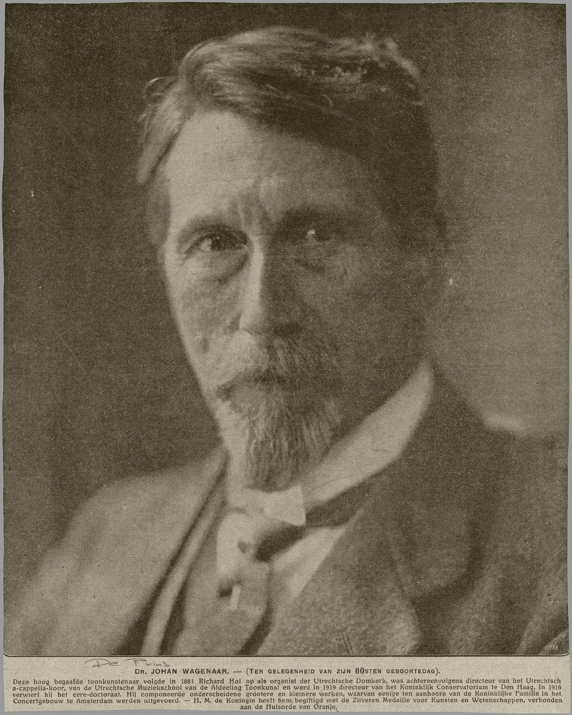 In 1888, he succeeded Richard Hol as organist of Utrecht Cathedral, and earned fame for his skills at organ performances. In Utrecht, Wagenaar became a teacher at the music school in 1896, and the school’s director in 1904. He also received an appointment with the Utrecht Municipal Orchestra (Utrechtsch Stedelijk Orkest). Between 1919 and 1937, Wagenaar was director of the Royal Conservatory at the Hague. His pupils included Peter van Anrooy, Emile Enthoven, Henri van Goudoever, Alexander Voormolen, Leon Orthel, Allard de Ridder, Willem Pijper (1894-1947) and Bernard Wagenaar.