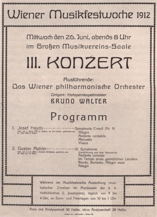 Chronology: Gustav Mahler legacy. Location: Gesellschaft der Musikfreunde Nature: Musikfestwoche Vienna 1912