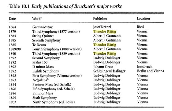Theodor Rättig started his firm in Vienna in 1878, and led a quiet existence publishing mainly works for male chorus. However, there was one exception, Bruckner’s 3rd Symphony. Bearing in mind the length of Bruckner’s symphonies, and the composer’s tendency to make several revisions even after first publication, one symphony by this composer provided the publisher with as much business as five by any other composer. Later, a branch of Theodor Rättig opened in Leipzig in 1897. Bought by Lienau ca. 1910.