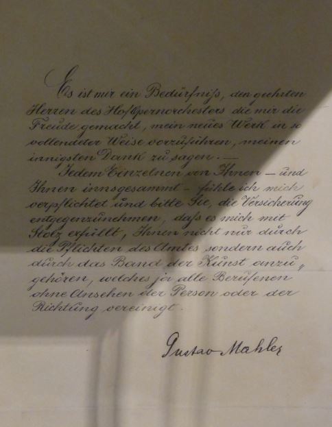 The Vienna Philharmonic Orchestra (VPO) played two rehearsals of Mahlers Symphony No. 5 in 1904, in order to enable the composer to make corrections before publication of the composition. These were followed by two unpaid rehearsals for Mahler’s Symphony No. 6 in 05-1906. In this letter, Mahler thanks the musicians for their accomodation.