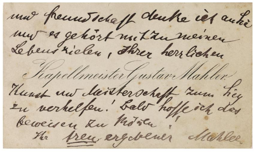 Business card Kapellmeister Gustav Mahler (1860-1911). Printed visiting card signed and inscribed (‘Mahler’) with a fifteen-line autograph message to a conductor, conceding that he has annoyed him for some time, and that he has been buffeted by the waves of fortune, but that, although life is still tempestuous, he hopes to be able to devote himself to serving those excellent artistic qualities in the recepient which he has always admired.