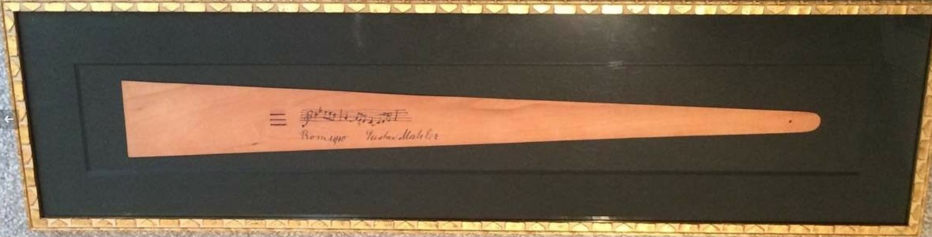 Mahler visited Rome to conduct the Orchestra Nazionale di Santa Cecilia in March, 1907 and again in April, 1910. Based on the dates of the previously surrounding fan blades, the present quotation was presumably inscribed on this occasion in 1910. The beginning of the theme written here very closely resembles one of the themes from Strauss’ Salome, though it does not appear in this key in the opera. Nor does the theme come from any of the works conducted by Mahler in Rome during this visit (as per Knud Martner in “Mahler’s Concerts”), which included Wagner (Siegfried Idyll, Tannhäuser Overture), Strauss (Till Eulenspiegel) and Bach-Mahler (Suite for Orchestra) in the first concert, and Tchaikovsky Pathétique, Wagner Meistersinger and Siegfried Idyll, and Beethoven Leonore No. 3 in the second. In consultation with leading Mahler scholars and conductors, we believe this quotation to be an original and previously unrecorded theme by Mahler.