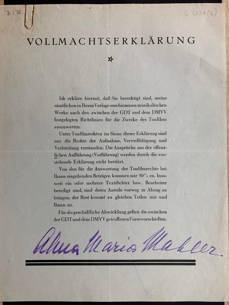 • 1931: 03-01-1931: Signing of a “Vollmachtserklärung” (power of attorney authorization) that declares that Alma Mahler (1879-1964) grants the right to use all the works of Mahler issued by this publisher Bote & Bock music publishers [Ed. Bote & G. Bock of Berlin] in film productions, and establishes her right to 50% of the profits from such use.